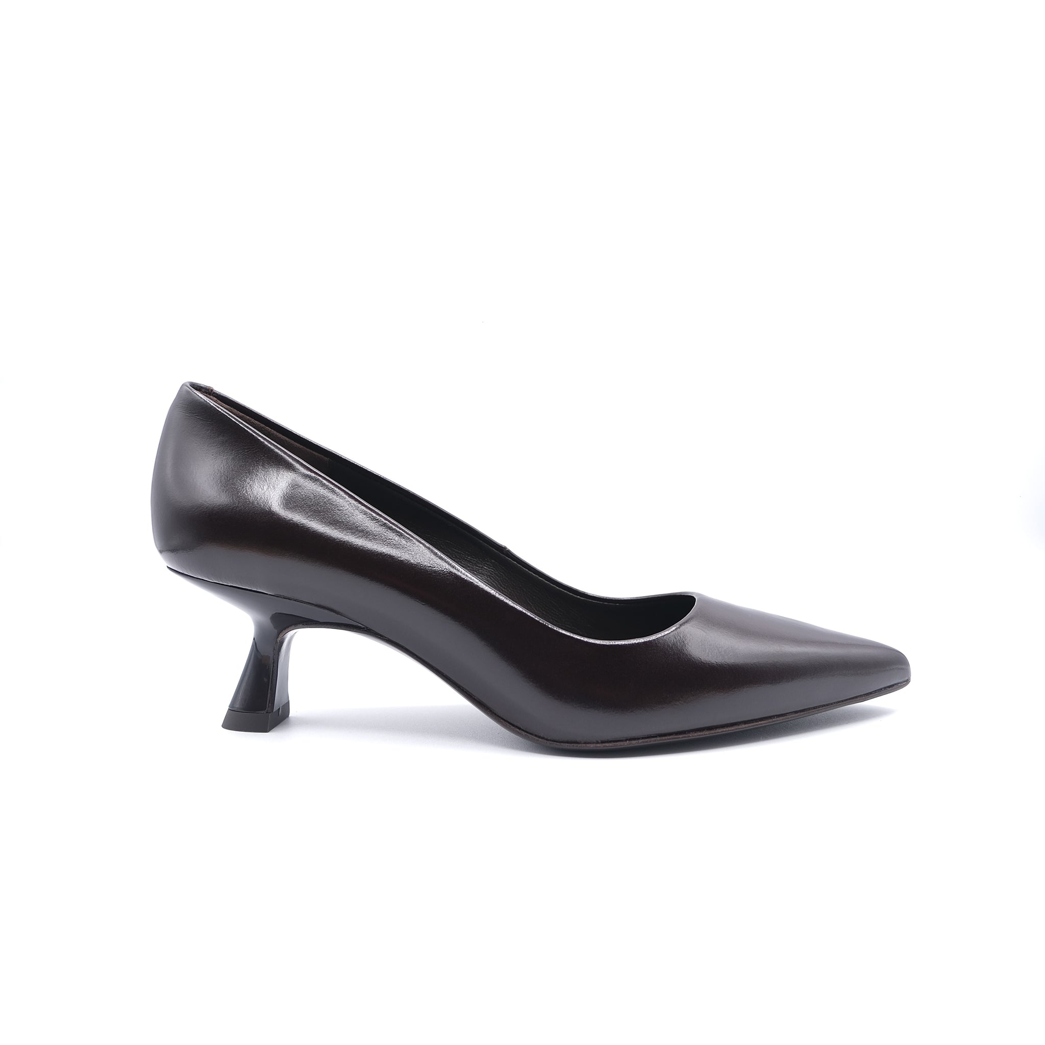 Women’s chocolate brown Florentique leather pump with subtle shine and slanted heel. A sophisticated classic handcrafted in Spain for polished everyday wear.