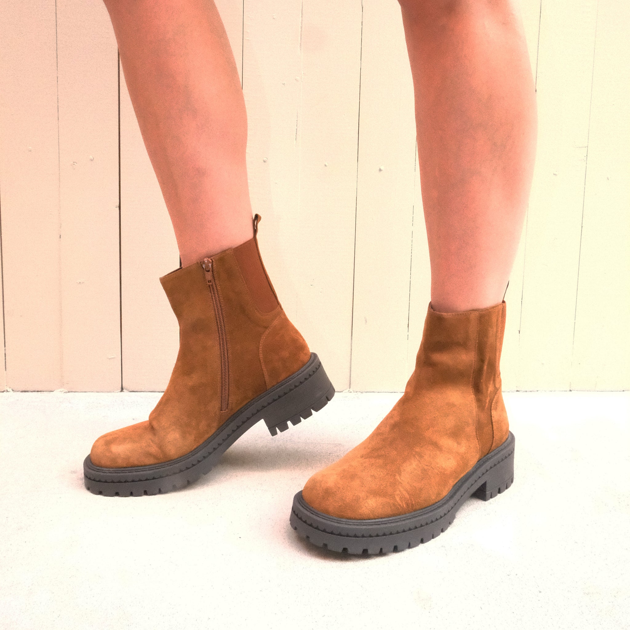 Tan suede Chelsea boots with zipper and elastic side panel. Handcrafted in Spain for versatile day-to-night wear.